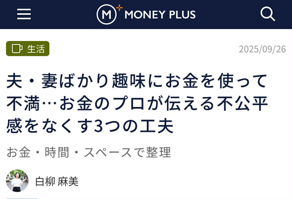 くらしの経済メディア『MONEY PLUS』(マネーフォワード社)9月の執筆記事が掲載されました9月26日に掲載された記事のテーマは 「夫・妻ばかり趣味にお金を使って不満…お金のプロが伝える不公平感をなくす3つの工夫」です。 ご結婚されているお客様のご相談をお受けする中で、よくお聞きするお悩みをテーマにしてみました。一緒に暮らすご夫婦だか...